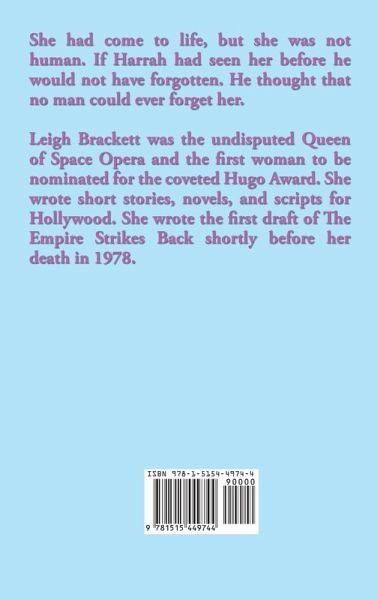 She had come to life, but she was not human. If Harrah had seen her before he would not have forgotten. He thought that no man could ever forget her. Leigh Brackett was the undisputed Queen of Space Opera and the first women to be nominated for the coveted Hugo Award. She wrote short stories, novels, and scripts for Hollywood. She wrote the first draft of the Empire Strikes Back shortly before her death in 1978.