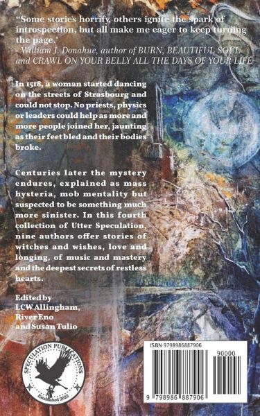 In 1518, a woman started dancing on the streets of Strasbourg and could not stop. No priests, physics or leaders could help as more and more people joined her, jaunting as their feet bled and their bodies broke. Centuries later the mystery endures, explained as mass hysteria, mob mentality but suspected to be something much more sinister. In this fourth collection of Utter Speculation, nine authors offer stories of witches and wishes, love and longing, of music and mastery and the deepest secrets of restless hearts. "Real-life medieval madness and chaos that was utterly frightening becomes utterly fascinating in The Dancing Plague collection from Speculation Publishing. From Brother Frix's monastery infirmary horrors ("This Way Lies Madness"/Wenzel) to Frau Troffea's cockroach stomp ("Shake, Rattle and Roll"/Updike), this is recommended reading." - Chris Bauer, author of crime thrillers about Philadelphia including 2 STREET, (where the city's most sacred group of dancers, the Philly Mummers, also die in bunches) "I'm always tickled when I hear a new Speculation is imminent because I know I'm in for a ride through unfamiliar, if not unsettling, terrain. The Dancing Plague collection is no exception. Some stories horrify, others ignite the spark of introspection, but all make me eager to keep turning the page." - William J. Donahue, author of BURN, BEAUTIFUL SOUL and CRAWL ON YOUR BELLY ALL THE DAYS OF YOUR LIFE "LCW Allingham and her two cohorts have come up with another thematic anthology in their Collection of Utter Speculation series. The Dancing Plague relates to a contagious 16th Century malady in what is now France leading to the victims convulsively dancing in the streets. This clever collection offers nine original takes on the affliction from a variety of authors dealing with time travel to scientific investigation to a modern re-occurrence. Much fun." - Don Swaim, author of THE ASSASSINATION OF AMBROSE BIERCE: A LOVE STORY