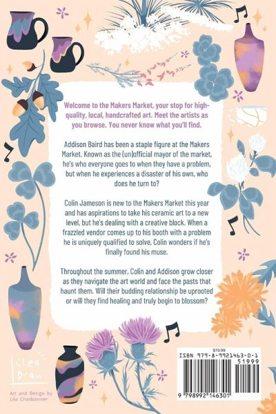 Welcome to the Makers Market, your stop for high-quality, local, handcrafted art. Meet the artists as you browse. You never know what you'll find. Addison Baird has been a staple figure at the Makers Market. Known as the (un)official mayor of the market, he's who everyone goes to when they have a problem, but when he experiences a disaster of his own, who does he turn to? Colin Jameson is new to the Makers Market this year and has aspirations to take his ceramic art to a new level, but he's dealing with a creative block. When a frazzled vendor comes up to his booth with a problem he is uniquely qualified to solve, Colin wonders if he's finally found his muse. Throughout the summer, Colin and Addison grow closer as they navigate the art world and face the pasts that haunt them. Will their budding relationship be uprooted or will they find healing and truly begin to blossom?