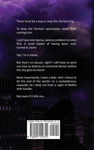 There must be a way to stop the city burning… To keep the Veritas’s apocalyptic vision from coming true. I just have one teensy, weensy problem to solve first. A small matter of having been, well, turned to stone. Yep, I’m a statue. But that’s no excuse, right? I still have to work out how to destroy an immortal demon before the city goes ka-boom. More importantly, I have a date. And I refuse to let the end of the world—or a cantankerous, cowardly rat—keep me from a night of Netflix with Xander. Not even if it kills me…