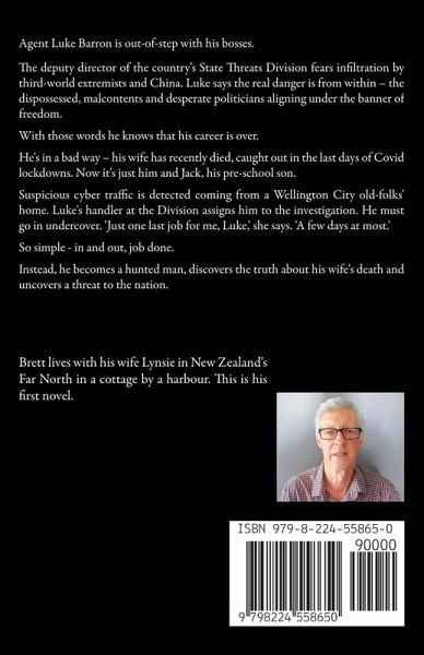 Agent Luke Barron is out-of-step with his bosses. The deputy director of the country's State Threats Division fears infiltration by third-world extremists and China. Luke says the real danger is from within - the dispossessed, malcontents and desperate politicians aligning under the banner of freedom. With those words he knows that his career is over. He's in a bad way - his wife has recently died, caught out in the last days of Covid lockdowns. Now it's just him and Jack, his pre-school son. Suspicious cyber traffic has been detected coming from a Wellington City old-folks' home. Luke's handler at the Division assigns him to the investigation. He must go in undercover, as a cleaner. 'One last job for me,' she says. 'Just a few days, at most.' So simple, in and out, job done. Instead, he becomes a hunted man, discovers the truth about his wife's death and uncovers a threat to the nation.