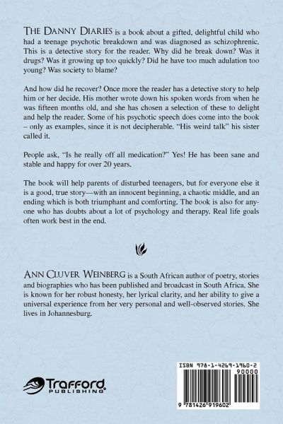 The Danny Diaries is a book about a gifted, delightful child who had a teenage psychotic breakdown and was diagnosed as schizophrenic. This is a detective story for the reader. Why did he break down? Was it drugs? Was it growing up too quickly? Did he have too much adulation too young? Was society to blame? And how did he recover? Once more the reader has a detective story to help him or her decide. His mother wrote down his spoken words from when he was fifteen months old, and she has chosen a selection of these both to delight and help the reader. Some of his psychotic speech does come into the book - only as examples, since it is not decipherable. "His weird talk" his sister called it. People ask, "Is he really off all medication?" Yes! He has been sane and stable and happy for over 20 years. The book will help parents of disturbed teenagers, but for everyone else it is a good, true story-with an innocent beginning, a chaotic middle, and an ending which is both triumphant and comforting. The book is also for anyone who has doubts about a lot of psychology and therapy. Real life goals are what work in the end. Ann Cluver Weinberg is a South African author of poetry, stories and biographies who has been published and broadcast in South Africa. She is known for her robust honesty, her lyrical clarity, and her ability to give a universal experience from her very personal and well-observed stories. She lives in Johannesburg.