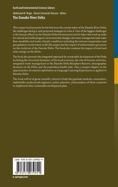 Part 1 : DRD Environmental Change.- Chapter 1 - The Danube Delta Environment Changes Generated by Human Activities (Laura Tiron Dutu, Nicolae Panin, Florin Dutu, Adrian Popa, Gabriel Iordache, Iulian Pojar, Irina Catianis).- Chapter 2 - Danube Delta Lakes as Sinks for Natural and Anthropogenic Environmental Changes (Irina Catianis ,Adriana Maria Constatinescu, Dan Vasiliu, Albert Scrieciu Adrian Stanica).- Chapter 3 - Assessment of Climate Conditions and Changes Detected over the Historical Period (1961-2013) (Adina-Eliza CROITORU, Csaba Horvath, Titus-Cristian Man).- Par 2: Water and Waste Management.- Chapter 4 - Water Management on the Territory of the Danube Delta Biosphere Reserve (Petru-Dragos Morar, Dana Rus, Abdelazim Negm).- Chapter 5 - Integrated Waste Management in the Danube Delta Biosphere Reserve (Petru-Drago Morar).- Part 3: Societal Dimensions: Demographics, Health and Education.- Chapter 6 - Specificity of the Demographic Dynamics in the Danube Delta (Cristian Constantin Draghici, Alexandra Grecu Cosmin Olteanu Alexandru Paru , Gruia Andreea Karina, Gabriel Dascalu).- Chapter 7 - Infrastructure evolution and spatial dimension of the population health state from the Danube Delta (Marian Marin, Iulia Nedelcu, Donatella Carboni , Anca Bratu , Secil Omer, Alexandra Grecu).- Chapter 8 - The Danube Delta: Opportunities of Content Exploitation as Language Learning Experiences (Dana Rus).- Part 4 : Integrated Sustainable Development.- Chapter 9 - The Societal Benefits as Results of Managing the Danube Delta Landscape and Changing the Stakeholders' Behaviours (Camelia Ionescu, Corina Gheorghiu, and Tanvi Walawalkar).- Chapter 10 - Climate Suitability for Sustainable Economic Growth Through Tourism in the Danube Delta (Adina-Eliza Croitoru, Adina-Viorica Rus, Titus-Cristian Man, Victor Malairau, Alexandru Matei).- Chapter 11 - The Structural Dynamics of the Local Economy in the Danube Delta (Daniel Peptenatu, Andreea Karina Gruia, Alexandra Grecu, Camelia Teodorescu, Marian Marin, Raluca Dinescu, Catalin Razvan Dobrea , Razvan Mihail Papuc, Cosmin Olteanu).- Chapter 12 - The Role of Tourism Activities in the Integrated Economic Development of the Danube Delta (Radu-Daniel Pintilii, Andreea Karina Gruia, Alexandra Grecu, Oana Cre u, Donatella Carboni).- Chapter 13 - Danube Delta Integrated Sustainable Development Strategy (Daniel Constantin Diaconu, Mihnea Cristian Popa, Daniel Peptenatu, Abdelazim Negm).