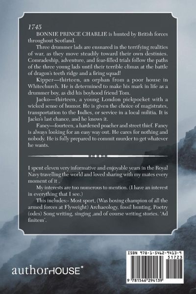 1745 Bonnie Prince Charlie is hunted by British forces throughout Scotland. Three drummer lads are ensnared in the terrifying realities of war, as they move steadily toward their own destinies. Comradeship, adventure, and fear-filled trials follow the paths of the three young lads until their terrible climax at the battle of dragon's teeth ridge and a firing squad! Kipper-thirteen, an orphan from a poor house in Whitechurch. He is determined to make his mark in life as a drummer boy, as did his boyhood friend Tom. Jacko-thirteen, a young London pickpocket with a wicked sense of humor. He is given the choice of magistrates, transportation to the Indies, or service in a local militia. It is Jacko's last chance, and he knows it. Fancy-fourteen, a hardened poacher and street thief. Fancy is always looking for an easy way out. He cares for nothing and nobody. He is fully prepared to commit murder to get whatever he wants.