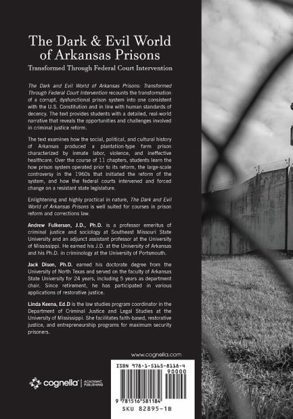 The Dark and Evil World of Arkansas Prisons: Transformed Through Federal Court Intervention recounts the transformation of a corrupt, dysfunctional prison system into one consistent with the U.S. Constitution and in line with human standards of decency. The text provides students with a detailed, real-world narrative that reveals the opportunities and challenges involved in criminal justice reform. The text examines how the social, political, and cultural history of Arkansas produced a plantation-type farm prison characterized by inmate labor, violence, and ineffective healthcare. Over the course of 11 chapters, students learn the how prison system operated prior to its reform, the large-scale controversy in the 1960s that initiated the reform of the system, and how the federal courts intervened and forced change on a resistant state legislature. Enlightening and highly practical in nature, The Dark and Evil World of Arkansas Prisons is well suited for courses in prison reform and corrections law. Andrew Fulkerson, J.D., Ph.D. is a professor emeritus of criminal justice and sociology at Southeast Missouri State University and an adjunct assistant professor at the University of Mississippi. He earned his J.D. at the University of Arkansas and his Ph.D. in criminology at the University of Portsmouth. Dr. Fulkerson is a retired judge and prosecuting attorney in the state of Arkansas. Jack Dison, Ph.D. holds a doctorate degree from The University of North Texas and served on the faculty of Arkansas State University for 24 years, including 5 years as department chair. Since retirement, he has participated in various applications of restorative justice. Linda Keena, Ed.D is the law studies program coordinator in the Department of Criminal Justice and Legal Studies at the University of Mississippi, where she teaches the law of corrections. She facilitates faith-based, restorative justice, and entrepreneurship programs for maximum security prisoners and has a record of scholarly publications, which reflect a variety of topics in corrections.