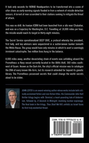 It took only seconds for NORAD Headquarters to be transformed into a scene of utter chaos as early warning signals flooded in from a network of missile detection sensors. A torrent of men scrambled to their stations seeking to mitigate the threat of attack. This was no drill. An Iranian ICBM had been launched from a silo near Chabahar, and was on a trajectory for Washington, D.C. Travelling at 18,000 miles per hour, the missile would reach its target in thirty-eight minutes. The Secret Service operationalized DEEP DIVE, a protocol whereby the president, first lady, and key advisors were sequestered in a subterranean bunker beneath the White House. The group would have only minutes in which to avert a seemingly imminent catastrophe. Two million lives hung in the balance. 8,000 miles away, another devastating chain of events was unfolding aboard the Prometheus - a Navy vessel currently located in the Ulithi Atoll, 360 miles southwest of Guam. Known as the Dark Ark, the ship's official mission was to catalogue the DNA of every known life-form, but its research extended far beyond its genetic library. The Prometheus possessed secrets that could change the world - secrets about to be stolen.