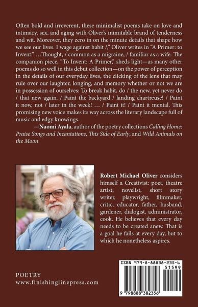 Robert Michael Oliver considers himself a Creativist: poet, theatre artist, novelist, short story writer, playwright, filmmaker, critic, educator, father, husband, gardener, dialogist, administrator, cook. He believes that every day needs to be created anew. That is a goal he fails at every day, but to which he nonetheless aspires.