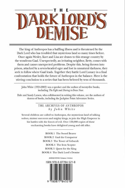 The king of Anthropos has a baffling illness and is threatened by the Dark Lord who has troubled that mysterious land so many times before. Once again Wesley, Kurt and Lisa are drawn to this strange country by the wondrous Gaal. TUnexpectedly, an irritating neighbor, Betty, comes along with them. Despite the problems she causes--and despite being thrown into prison, attacked by a seven-headed ogre and lost in unnatural darkness, the group seeks to follow where Gaal leads. Together they battle Lord Lunacy in a final confrontation that holds the future of Anthropos in the balance. THere is the stirring conclusion to John White's mythical adventure series that has been beloved by tens of thousands.