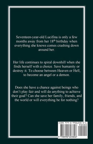 Seventeen-year-old Lucifina is only a few months away from her 18th birthday when everything she knows comes crashing down around her. Her life continues to spiral downhill when she finds herself with a choice. Save humanity or destroy it. To choose between Heaven or Hell, to become an angel or a demon. Does she have a chance against beings who don't play fair and will do anything to achieve their goal? Can she save her family, friends, and the world or will everything be for nothing?
