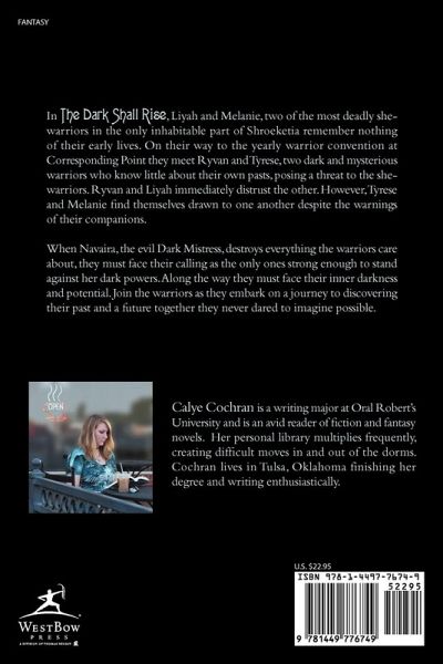 In The Dark Shall Rise, Liyah and Melanie, two of the most deadly she-warriors in the only inhabitable part of Shroeketia remember nothing of their early lives. On their way to the yearly warrior convention at Corresponding Point they meet Ryvan and Tyrese, two dark and mysterious warriors who know little about their own pasts, posing a threat to the she-warriors. Ryvan and Liyah immediately distrust the other. However, Tyrese and Melanie find themselves drawn to one another despite the warnings of their companions. When Navaira, the evil Dark Mistress, destroys everything the warriors care about, they must face their calling as the only ones strong enough to stand against her dark powers. Along the way they must face their inner darkness and potential. Join the warriors as they embark on a journey to discovering their past and a future together they never dared to imagine possible.