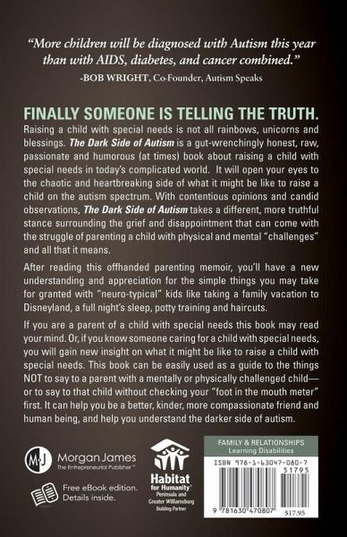 There should be no shame in the fact that parenting a child with Autism can be difficult and sometimes dark. There are how to "cure" your child of autism books which can leave parents feeling like a failure if those ?cures? fall flat and there are many books that punctuate the ?blessings?. The Dark Side of Autism focuses on the importance of healing yourself and family while accepting when something may be out of your control. This book will remind parents that it's ok to grieve the loss of a child and the broken dreams you unmistakably had for them. It will help parents and caregivers come to terms that heartbreak and disappointment can be a big part of the diagnosis but also gives tips on how to break through the darkness and grief to see the light.