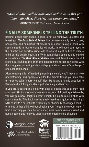 There should be no shame in the fact that parenting a child with Autism can be difficult and sometimes dark. There are how to "cure" your child of autism books which can leave parents feeling like a failure if those "cures" fall flat and there are many books that punctuate the "blessings". The Dark Side of Autism focuses on the importance of healing yourself and family while accepting when something may be out of your control. This book will remind parents that it's ok to grieve the loss of a child and the broken dreams you unmistakably had for them. It will help parents and caregivers come to terms that heartbreak and disappointment can be a big part of the diagnosis but also gives tips on how to break through the darkness and grief to see the light.