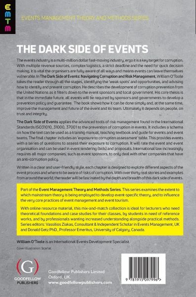 The events industry is a multi-million dollar industry, ergo it is a key target for corruption. 'The Dark Side of Events' identifies the â weak spotsâ and opportunities, and advises how to identify and prevent corruption. It applies the advanced tools of risk management found in the ISO31010, 31000, 37001 to the prevention of corruption in events.