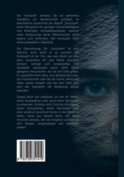 Dieses Buch soll helfen. Es soll denen, die nicht wissen, was eine Bitch, ein Narzisst, ein Psychopath, ein Soziopath oder eine toxische Person ist, dabei helfen, solche Wesen zu erkennen! Und es soll denen, die bereits mit einer toxischen Person zusammenleben, die Augen öffnen! Hier könnt ihr abgrundtief böse Geschichten lesen, die irgendwo zwischen Himmel und Hölle passieren und in denen gute Menschen von grausamen und asozialen Unmenschen gepeinigt, erniedrigt, bestohlen und bis zum Selbstmord getrieben werden! Lies dieses Buch und lerne, was toxische Personen mit dir machen! Wie sie dich aussuchen, wie sie dich fangen und wie sie dich belügen und beherrschen! Lerne, was sie tun, um dich für sich arbeiten zu lassen, wie sie dir dein Geld stehlen und wie sie dich jeden Tag im Bett vergewaltigen, ohne dass du es auch nur merkst! Verstehe, warum du das alles zulässt, ohne zu fragen, und lerne, wie du durch ihre Lügen und Manipulationen blind und taub gemacht wirst! Nur so kannst du toxische Personen erkennen und dich gegen sie wehren!