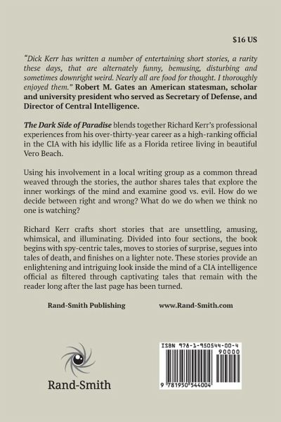 The Dark Side of Paradise blends together Richard Kerr’s professional experiences from his over-thirty-year career as a high-ranking official in the CIA with his idyllic life as a Florida retiree living in beautiful Vero Beach. Using his involvement in a local writing group as a common thread weaved through the stories, the author shares tales that explore the inner workings of the mind and examine good vs. evil. How do we decide between right and wrong? What do we do when we think no one is watching? Richard Kerr crafts short stories that are unsettling, amusing, whimsical, and illuminating. Divided into four sections, the book begins with spy-centric tales, moves to stories of surprise, segues into tales of death, and finishes on a lighter note. All the while, regardless of the section, the author’s writer group and some of its members are weaved in and out of the stories to provide a common bond. Only someone of his unique background could provide such an enlightening and intriguing look inside the mind of a CIA intelligence official as filtered through captivating tales that remain with the reader long after the last page has been turned.