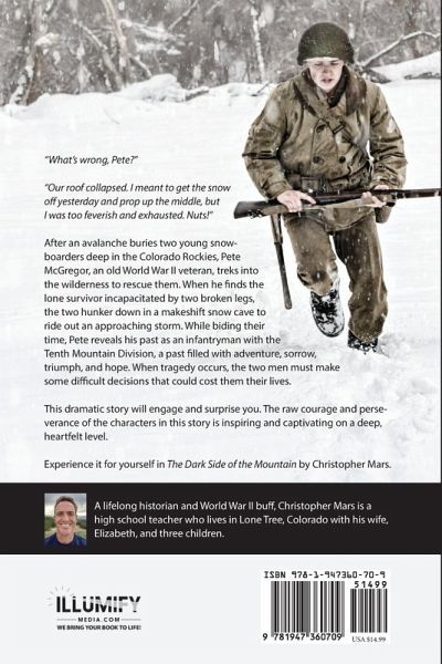 "What's wrong, Pete?" "Our roof collapsed. I meant to get the snow off yesterday and prop up the middle, but I was too feverish and exhausted. Nuts!" After an avalanche buries two young snowboarders deep in the Colorado Rockies, Pete McGregor, an old World War II veteran, treks into the wilderness to rescue them. When he finds the lone survivor incapacitated by two broken legs, the two hunker down in a makeshift snow cave to ride out an approaching storm. While biding their time, Pete reveals his past as an infantryman with the Tenth Mountain Division, a past filled with adventure, sorrow, triumph, and hope. When tragedy occurs, the two men must make some difficult decisions that could cost them their lives. This dramatic story will engage and surprise you. The raw courage and perseverance of the characters in this story is inspiring and captivating on a deep, heartfelt level. Experience it for yourself in The Dark Side of the Mountain by Christopher Mars.