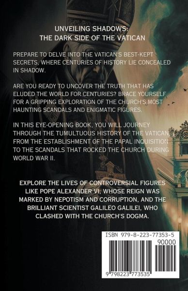 "Unveiling Shadows: The Dark side of the Vatican" is a gripping and meticulously researched exploration of the hidden facets of the Vatican's history, revealing the institution's darkest secrets and controversies. Delve into the shadows of one of the world's most powerful religious institutions and uncover the truth that has long been concealed. In this eye-opening book, you will journey through the tumultuous history of the Vatican, from the establishment of the Papal Inquisition to the scandals that rocked the Church during World War II. Explore the lives of controversial figures like Pope Alexander VI, whose reign was marked by nepotism and corruption, and the brilliant scientist Galileo Galilei, who clashed with the Church's dogma. "Unveiling Shadows" sheds light on the scandals that have plagued the Vatican, including the sexual abuse crisis that has shaken the faith of millions. Discover the stories of those who spoke out against abuse and faced the wrath of the Church's hierarchy. This meticulously researched book also offers a timeline of significant events, biographies of key figures, and an in-depth examination of high-profile sexual abuse cases within the Church. It confronts the moral dilemmas faced by the Vatican, the role of secrecy in its operations, and the ongoing quest for justice and accountability. "Unveiling Shadows" is a compelling and thought-provoking account that challenges the traditional narrative and delves deep into the heart of the Vatican's darkest moments. It is a must-read for anyone seeking to understand the complex history and controversies surrounding one of the world's most influential institutions.