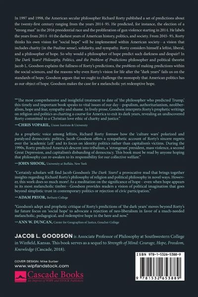 In 1997 and 1998, the American secular philosopher Richard Rorty published a set of predictions about the twenty-first century ranging from the years 2014-95. He predicted, for instance, the election of a ""strong man"" in the 2016 presidential race and the proliferation of gun violence starting in 2014. He labels the years from 2014-44 the darkest years of American history, politics, and society. From 2045-95, Rorty thinks his own vision for ""social hope"" will be implemented within American society--a vision that includes charity (in the Pauline sense), solidarity, and sympathy. Rorty considers himself a leftist, liberal, and a philosopher of hope. So why would a philosopher of hope predict such darkness and despair? In The Dark Years? Philosophy, Politics, and the Problem of Predictions philosopher and political theorist Jacob L. Goodson explains the fullness of Rorty's predictions, the problem of making predictions within the social sciences, and the reasons why even Rorty's vision for life after the ""dark years"" fails us on the standards of hope. Goodson argues that we ought to challenge the monopoly that American politics has as our object of hope. Goodson makes the case for a melancholic yet redemptive hope.