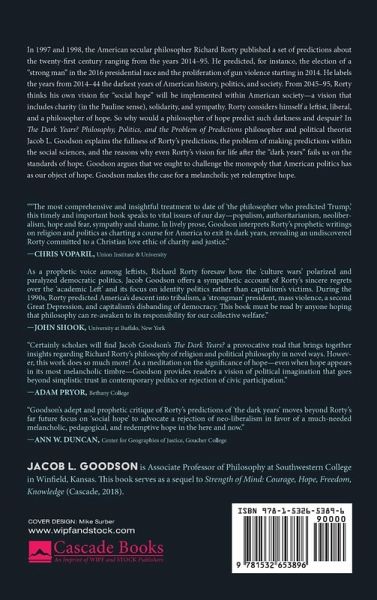 In 1997 and 1998, the American secular philosopher Richard Rorty published a set of predictions about the twenty-first century ranging from the years 2014-95. He predicted, for instance, the election of a ""strong man"" in the 2016 presidential race and the proliferation of gun violence starting in 2014. He labels the years from 2014-44 the darkest years of American history, politics, and society. From 2045-95, Rorty thinks his own vision for ""social hope"" will be implemented within American society--a vision that includes charity (in the Pauline sense), solidarity, and sympathy. Rorty considers himself a leftist, liberal, and a philosopher of hope. So why would a philosopher of hope predict such darkness and despair? In The Dark Years? Philosophy, Politics, and the Problem of Predictions philosopher and political theorist Jacob L. Goodson explains the fullness of Rorty's predictions, the problem of making predictions within the social sciences, and the reasons why even Rorty's vision for life after the ""dark years"" fails us on the standards of hope. Goodson argues that we ought to challenge the monopoly that American politics has as our object of hope. Goodson makes the case for a melancholic yet redemptive hope.