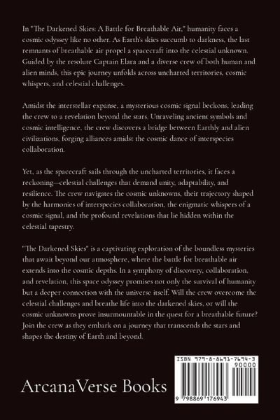 In "The Darkened Skies: A Battle for Breathable Air," humanity faces a cosmic odyssey like no other. As Earth's skies succumb to darkness, the last remnants of breathable air propel a spacecraft into the celestial unknown. Guided by the resolute Captain Elara and a diverse crew of both human and alien minds, this epic journey unfolds across uncharted territories, cosmic whispers, and celestial challenges. Amidst the interstellar expanse, a mysterious cosmic signal beckons, leading the crew to a revelation beyond the stars. Unraveling ancient symbols and cosmic intelligence, the crew discovers a bridge between Earthly and alien civilizations, forging alliances amidst the cosmic dance of interspecies collaboration. Yet, as the spacecraft sails through the uncharted territories, it faces a reckoning-celestial challenges that demand unity, adaptability, and resilience. The crew navigates the cosmic unknowns, their trajectory shaped by the harmonies of interspecies collaboration, the enigmatic whispers of a cosmic signal, and the profound revelations that lie hidden within the celestial tapestry. "The Darkened Skies" is a captivating exploration of the boundless mysteries that await beyond our atmosphere, where the battle for breathable air extends into the cosmic depths. In a symphony of discovery, collaboration, and revelation, this space odyssey promises not only the survival of humanity but a deeper connection with the universe itself. Will the crew overcome the celestial challenges and breathe life into the darkened skies, or will the cosmic unknowns prove insurmountable in the quest for a breathable future? Join the crew as they embark on a journey that transcends the stars and shapes the destiny of Earth and beyond.
