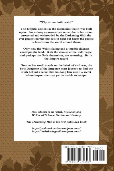 Why do we build walls? The Empire: ancient as the mountains that it was built upon. For as long as anyone can remember it has stood, protected and enshrouded by the Darkening Wall: the ever present barrier that lets in light but keeps the people isolated from the world around them. Only now the Wall is failing and a terrible sickness envelopes the land. With the demise of the wall magic, and perhaps the Gods themselves, are returning. But is the Empire ready? Now, as her world stands on the brink of civil war, the First Daughter of the Emperor must journey to find the truth behind a secret that has long lain silent: a secret whose impact she may yet be unable to escape.