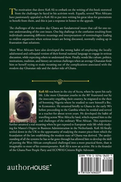 The motivation that drove Kofi Ali to embark on the writing of this book stemmed from the challenges he faced in his activism work. Equally, several West Africans have passionately appealed to Kofi Ali to put into writing his great ideas for generations to benefit from them, and this is just a response in honor to the appeals. The challenges of the modern day Ghana are fundamental issues that call for one-to-one understanding of the core issues. One big challenge is the confusion resulting from individuals assuming different meanings and interpretations of terminologies leading to endless arguments when serious issues are being discussed, normally ending up in frustration than solutions. Most West Africans have also developed the wrong habit of employing the locally adulterated and colloquial version of their formal national language to engage in serious discussion, while expecting others to understand them. Finally, words like culture, politics, institutions, tradition, and history are serious challenges when an average Ghanaian finds him or herself trying to make meaning out of the complications associated with the modern day Ghanaian side and the darker side of Ghana.