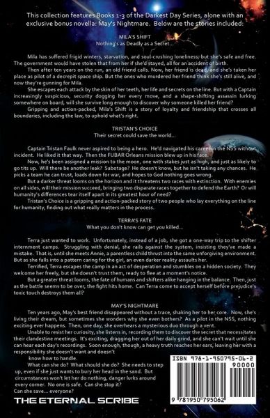This collection features Books 1-3 of the Darkest Day Series, along with an exclusive bonus novella: May's Nightmare. Below are the stories included: Mila's Shift Hiding from a government bent on eradicating her kind, a paranoid shape-shifter steals her dead friend's identity to board a military spaceship, but when the captain discovers her secret, she must learn to trust again or no one will survive. Tristan's Choice After he receives orders for a new mission, an unambitious space ship captain transports diplomats to the moon for a historic treaty negotiation with an alien race. But when an alien ship attacks, interrupting the talks, he must warn Earth or everyone will die. Terra's Fate When a child in her care shifts for the first time, a prejudiced shape-shifter in denial must escape the shifter camp imprisoning them both. But when an alien invasion looms, threatening what little peace she's found, she must accept herself or lose everyone everything. May's Nightmare After overhearing a mysterious conversation through a vent, a listless spaceship pilot decides to spy on them. But after nearly getting caught, she has to do something before someone else gets killed.