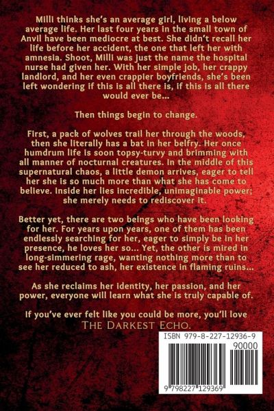 Milli thinks she's an average girl, living a below average life. Her last four years in the small town of Anvil have been mediocre at best. She didn't recall her life before her accident, the one that left her with amnesia. Shoot, Milli was just the name the hospital nurse had given her. With her simple job, her crappy landlord, and her even crappier boyfriends, she's been left wondering if this is all there is, if this is all there would ever be... Then things begin to change. First, a pack of wolves trail her through the woods, then she literally has a bat in her belfry. Her once humdrum life is soon topsy-turvy and brimming with all manner of nocturnal creatures. In the middle of this supernatural chaos, a little demon arrives, eager to tell her she is so much more than what she has come to believe. Inside her lies incredible, unimaginable power; she merely needs to rediscover it. Better yet, there are two beings who have been looking for her. For years upon years, one of them has been endlessly searching for her, eager to simply be in her presence, he loves her so... Yet, the other is mired in long-simmering rage, wanting nothing more than to see her reduced to ash, her very existence in flaming ruins... As she reclaims her identity, her passion, and her power, everyone will learn what she is truly capable of. If you've ever felt like you could be more, you'll love The Darkest Echo.