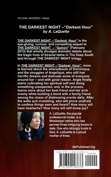 THE DARKEST NIGHT -"DARKEST HOUR" is the eye-gluing, curious and compelling sequel to THE DARKEST NIGHT - "GEMINI" that wholly divulges more details about the tragic details of the lives of biracial twins told through THE DARKEST NIGHT trilogy. In DARKEST HOUR, more is learned about the whereabouts of Dominique, and the struggles of Angelique, who still has horrific dreams and distrusts some of everyone. Angie finally starts cultivating her spiritual self and doing something unexpected and learns more about her best friend and her arch enemy while building a bond with a family friend among the chaos of dramatic daily events. After the walls quit crumbling, who will prove unafraid to confess things seen and heard? How many will have heartache? How many will still know joy?