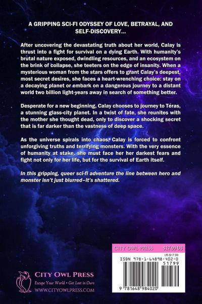 The most terrifying monsters are the ones that lurk inside... After discovering everything she's ever known has been a lie, Calay understands humanity's brutality firsthand. Now, depleted rations, unexplained aberrations, and an ecosystem in collapse have driven her to the brink of madness-even with Jacob by her side. When a mysterious woman sent from the stars promises to grant every desire Calay's ever locked away in her shattered heart, she's forced to make an impossible decision: remain on a dying Earth or journey to a planet two-billion lightyears away in an effort to save them all. Clinging to the dream she might yet find somewhere to call home, she agrees. After all, how much worse could it get? When she arrives on the shimmering, glass-city planet Téras, Calay desperately want to believe in a better future. Despite being haunted by the past she'll never escape, her hope is buoyed by the reunion with the mother she thought long-dead and the possibility of uniting their civilizations. The reality, however, is more horrifying than anything she could have imagined. As the universe descends into darkness, she finds herself trapped in the far reaches of deep space, face to face with dangerous forces, unyielding truths, and feral monsters that will force her to confront the darkest parts of herself, pushing her to the very limits of what it means to be human. In this gripping queer sci-fi odyssey, Calay's journey through love, betrayal, and self-discovery becomes a fight not only for her life, but the survival of Earth itself.