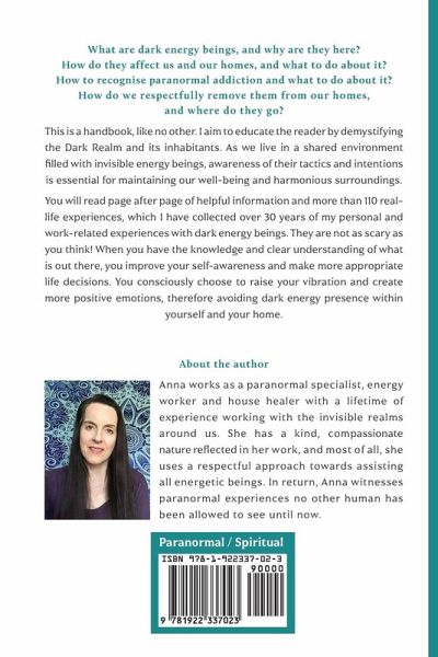 What are dark energy beings, and why are they here? How do they affect us and our homes, and what to do about it? How do we respectfully remove them from our home, and where do they go? How to recognise paranormal addiction and what to do about it!In your hands, you have a handbook like no other. This book aims to educate the reader by demystifying the Dark Realm and its inhabitants. As we live in a shared environment filled with invisible energy beings, awareness of their tactics and intentions is essential for maintaining our well-being and harmonious surroundings. You will read page after page of helpful information and more than 110 real-life experiences, which I have collected over 30 years of my personal and work-related experiences with dark energy beings. They are not as scary as you think! When you have the knowledge and clear understanding of what is out there, you improve your self-awareness and make more appropriate life decisions. You consciously choose to raise your vibration and create more positive emotions, therefore avoiding dark energy presence within yourself and your home.