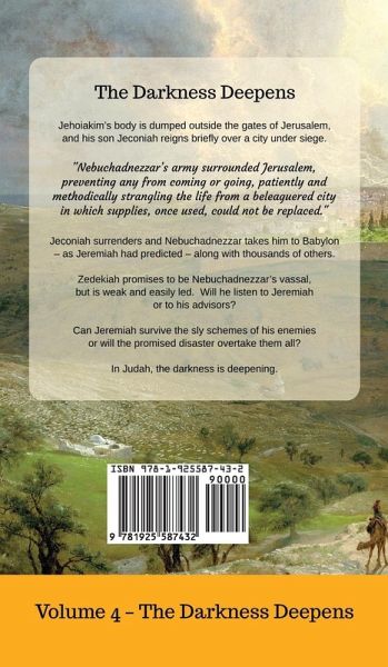 Terror on Every Side! The Life of Jeremiah: Volume 4 - The Darkness Deepens (Volume 4 of 6) Mark Morgan (Bible Tales Online - www.BibleTales.online) Jehoiakim's body is dumped outside the gates of Jerusalem, and his son Jeconiah reigns briefly over a city under siege. "Nebuchadnezzar's army surrounded Jerusalem, preventing any from coming or going, patiently and methodically strangling the life from a beleaguered city in which supplies, once used, could not be replaced." Jeconiah surrenders and King Nebuchadnezzar takes him to Babylon - as Jeremiah had predicted - along with thousands of others. Zedekiah promises to be Nebuchadnezzar's vassal, but is weak and easily led. Will he listen to Jeremiah or to his advisors? Can Jeremiah survive the sly schemes of his enemies or will the promised disaster overtake them all? In Judah, the darkness is deepening. Terror on Every Side! - The series The words of God came to Jeremiah as a fire, burning within him, and with them, his lifetime mission - a prophet to the nations. Jeremiah was a prophet of God for over 40 years, warning of judgement on the nation of Judah and all the nations around. Few would listen at all, and fewer still would take him seriously. Jeremiah lived to see the prophecies of destruction come true. No-one would believe his words until it was too late - and then there was Terror on Every Side! Previous volumes: ¿ Volume 1 - Early Days ¿ Volume 2 - As Good As It Gets ¿ Volume 3 - Darkness Falling Subsequent volumes: ¿ Volume 5 - No Remedy ¿ Volume 6 - That Broken Reed