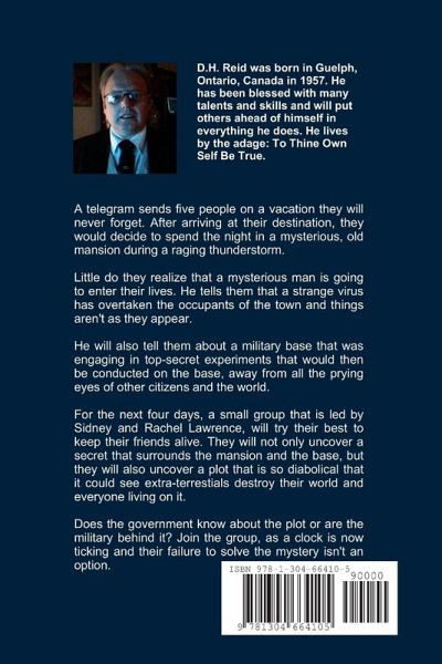 A telegram sends five people on a vacation they will never forget. Arriving at their destination, they decide to spend the night in a mysterious, old mansion during a raging thunderstorm. Little do they realize that a mysterious stranger is about to enter their lives. He tells them about a strange virus that has overtaken the occupants of the town and top-secret experiments that were conducted away from the prying eyes of the world. For the next four days, the small group tries their best to keep themselves alive. They not only uncover the secret that surrounds the old mansion, but they also discover a plot that is so diabolical that it could see extra-terrestrials destroy the world and everyone living on it. Join the small group as they work against time to expose the truth about the government and military leaders, before the government hides their secrets again forever from the prying eyes of the world.