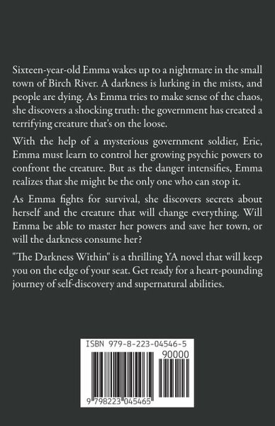Sixteen-year-old Emma wakes up to a nightmare: blood in the living room, her mother missing, and a darkness lurking in the mists outside. As people are dying, Emma discovers that the government has created a terrifying creature that not only escaped from their facility but is on a killing spree. To make matters worse, the creature seems to have a strange connection to the girl. As Emma struggles to come to terms with her new reality, she must also master her growing psychic powers that seem to have come out of nowhere. With the help of Eric, a government soldier with his own special abilities, Emma learns to control her powers and take on the Darkness. But as the creature closes in on Emma, she realizes that it's not just a mindless killer. It has a purpose, and Emma might be the only one who can stop it. As the final battle approaches, Emma must confront her fears and use all of her powers to save her town and herself. "The Darkness Within" is a thrilling tale of a young girl's journey of self-discovery and supernatural powers. Will Emma be able to master her abilities and defeat the Darkness, or will she become its next victim? Get your copy today of this action-packed young adult thriller.