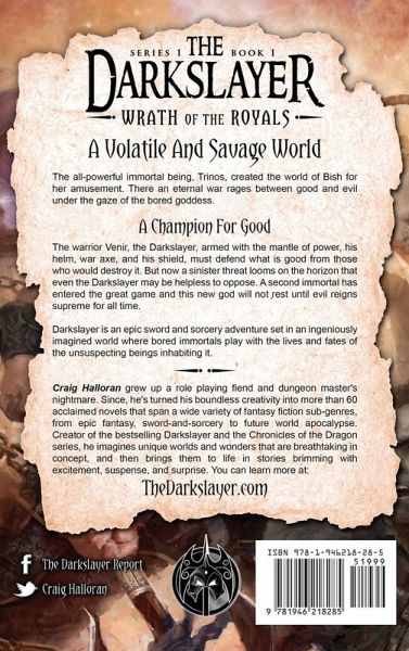 #1 Amazon Best Seller Epic Fantasy and Sword & Sorcery! Fans of R.A. Salvatore's-Drizzt Do' Urden, Frizt Leiber's Fafhrd and the Gray Mouser, David Gemmell's Druss the Legend, Raymond E. Feist's Pug the Wizard, and Robert E. Howard's Conan, delight in The Darkslayer series ... perhaps you will as well. A world of corruption and carnage has an indomitable defender... The all-powerful immortal being, Trinos, created the world of Bish for her own amusement. There an eternal war rages between good and evil under the gaze of the bored goddess. Humans battle monsters and each other in a savage, never-ending conflict--from the world's lush and perilous jungles to the streets of its decaying cities, rife with horror, death, and corruption, to the desolate wastes of the Outlands. And there is one who is charged with maintaining the delicate balance between light and darkness: the warrior Venir, the Darkslayer. Armed with the mantle of power, his helm, war axe, and his shield, Venir must defend what is good from those who would destroy it. Whether it's the monstrous underlings, emerging from below ground to wreak havoc and terror upon humanity, or the cruel and greedy Royals oppressing their own vulnerable race, no base, ruthless creature will escape his wrath. But now a sinister threat looms on the horizon that even the Darkslayer may be helpless too oppose. For a second immortal has entered the great game--and this new god will not rest until evil reigns supreme for all time. More ... On a volatile, savage world created by an entertainment-seeking goddess, the warrior known as the Darkslayer is the champion of good, battling monsters and men to maintain a fragile balance and prevent the world from descending into total chaos and desolation. From the mind of bestselling fantasist Craig Halloran, comes an epic sword and sorcery adventure set on an ingeniously imagined world where bored immortals play with the lives and fates of the unsuspecting beings inhabiting it. Once again Halloran proves himself to be the equal of R.A.Salvatore, Raymond E. Feist, and even George R.R. Martin when it comes to fantasy world-building and page-turning storytelling. With The Darkslayer, the author of the acclaimed Chronicles of the Dragon series gives his devoted fans yet another reason to rejoice. This fantasy romp through the wastelands has something for all Dungeons and Dragons lovers to thoroughly enjoy! A heavy mix of all the races and magic one would expect in a classic sword and sorcery adventure with some science fiction mixed in.