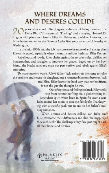For widow Elise Jorgenson, life had not turned out how she once dreamed. She must grapple with doing what's right versus pursuing her own dreams, knowing that the happiness just within her reach might never be attained. 20 years after co-ed Elise Jorgenson dreams of being crowned the Delta Rho Chi fraternity's "Darling" and marrying Howard Ellingson with plans for a family, Elise is childless and a widow. However, she is the housemother for the Gamma Alpha Beta sorority at the University of Washington. It's the mid-1960s and the job may prove to be more of a challenge than Elise anticipated, especially when she must confront freshman Riley Paxton. Rebellious and rowdy, Riley chafes against the sorority rules, dislikes her housemother, and struggles to improve her grades. Egged on by her boyfriend, she breaks rules and stays out past curfew, and rebels against Elise's authority. To make matters worse, Riley's father Jack arrives on the scene to solve the problem and rescue his daughter, but a romance blossoms between Jack and Elise. Riley learns the hard way that her boyfriend is not the guy she thought he was. Out of options and feeling isolated, Riley seeks help from her mother Virginia, a globetrotting independent spirit who's been in Spain for over a year. Riley invites her mom to join the family for Thanksgiving with a specific goal: put an end to her father's budding romance. When dreams and desires collide, can Riley and Elise overcome their differences and find the happiness they each seek? The challenges they face just might dash all their hopes and ambitions.
