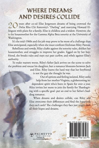 For widow Elise Jorgenson, life had not turned out how she once dreamed. She must grapple with doing what's right versus pursuing her own dreams, knowing that the happiness just within her reach might never be attained. 20 years after co-ed Elise Jorgenson dreams of being crowned the Delta Rho Chi fraternity's "Darling" and marrying Howard Ellingson with plans for a family, Elise is childless and a widow. However, she is the housemother for the Gamma Alpha Beta sorority at the University of Washington. It's the mid-1960s and the job may prove to be more of a challenge than Elise anticipated, especially when she must confront freshman Riley Paxton. Rebellious and rowdy, Riley chafes against the sorority rules, dislikes her housemother, and struggles to improve her grades. Egged on by her boyfriend, she breaks rules and stays out past curfew, and rebels against Elise's authority. To make matters worse, Riley's father Jack arrives on the scene to solve the problem and rescue his daughter, but a romance blossoms between Jack and Elise. Riley learns the hard way that her boyfriend is not the guy she thought he was. Out of options and feeling isolated, Riley seeks help from her mother Virginia, a globetrotting independent spirit who's been in Spain for over a year. Riley invites her mom to join the family for Thanksgiving with a specific goal: put an end to her father's budding romance. When dreams and desires collide, can Riley and Elise overcome their differences and find the happiness they each seek? The challenges they face just might dash all their hopes and ambitions.