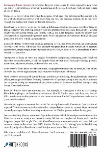 The Dating Game Uncensored chronicles dating in a free society. In other words, if you are raised in a society where marriages are strictly prearranged as the norm, then there's really no need to read a book on dating. The goals are to provide an interactive dating guide for all ages--for parents/guardians/adults to be aware of who their kids interact with and where and how and persuade everyone to do their own research and background checks (as deemed necessary). The objectives are to provide an easy-to-read guide for readers looking to acquire more knowledge on dating, to identify and analyze personality traits and characteristics, to acquire dating skills, to develop effective and safe dating strategies, to identify red flags and avoid dangerous situations, to learn from (or share) others' experiences by patronizing the following question-answer email: datingforallages@gmail.com, and how to find a date: socialize! The methodology for this book involved gathering information from informal and unstructured interviews with several individuals from different backgrounds and careers, namely school teachers, pediatricians, single people, married people, and divorcees, to name a few. Considerable internet research was done also. Perspectives are based on views and insights from family background, upbringing, early childhood education and socialization, social and neighborhood environment, human psychology, personal experiences, education, income, and social class and status. Over thirty type of daters are listed by definition, ranging from smart daters, to dumb, to serial killers, to haters, and to one-night standers. Pick your poison (if you rush in blindly). Many scenarios are discussed: dating during a pandemic, youth dating, dating for seniors, the power of love, training your children (bending the tree while it's young), dating in the city where everyone can see you vs. dating in a remote rural area, online dating vs. in-person, and blind dating vs. wing dating. There are lots more. Some hot-button issues are examined too. For example, at what age is it okay to start dating? Should dating be part of the school's curriculum? Should families teach their kids how to date? What are the two-to-five-year rule vs. the three-to-six-month rule? Do you believe in the zodiac (compatibility) signs? How do you approach someone for a date? Do pickup lines work? There is no "one size fits all approach." Hint: ask open-ended questions that can't yield simple yes or no answers. Pique someone's interest by trying to find out what they are interested in. The list goes on and on. Be my guest. Practice safe dating. How to look for red flags and which ones to look for are of paramount importance. There can be lots on intrigue and drama in dating. We live in a complex and diverse world that has dangerous people. Bad people. This book identifies numerous personality traits and types. Ask your romantic interest or date about their (life's) timeline. For instance, do "missing" years in their life story mean they might have been incarcerated? You just never know. Daters, beware! Take time to read this book. There's lots more. Did I mention a part 2? Stay tuned.