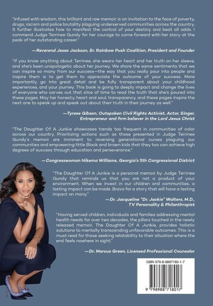 Five year old Terrinee Gundy decided that she would steer clear of a life of excuses as she was hellbent on being nobody's victim. In The Daughter Of A Junkie: A True Love Story, Terrinee is shrill and transparent regarding all of the unpredictable dangers she finessed with a junkie for a daddy. As a memoir romanticizing the unparalleled moments of her family's struggles, Terrinee is unapologetic about her family's ghetto love story. Despite her daddy's drug addiction to crack cocaine for over forty years, Terrinee was relentless to defy the odds of a chaotic, dysfunctional environment flooded with drugs, poverty, racism, the police, and an ineffable amount of calamity. The Daughter Of A Junkie: A True Love Story narrates a first-hand account of an extraordinary young girl who escaped the ghetto trappings and trickery of the underserved and impoverished communities in which she lived. With sheer determination, Terrinee realized her childhood dream of becoming a lawyer and a judge. She takes you through the slums of the Deep South with near death, appalling experiences that started in kindergarten and continued to "The Promise Land" on the college campus of Clark Atlanta University. Like the fictional tales of "Dope Fiend" by Donald Goins, her story is entertaining, thrilling yet factual, as well as, veracious through the lens of a highly educated junkie's daughter. Inspiring to anyone who is faced with non-stop, everlasting challenges related to drug addiction and beyond, Terrinee epitomizes the power of a determined woman who focuses on things that she can control versus things that could otherwise control her.
