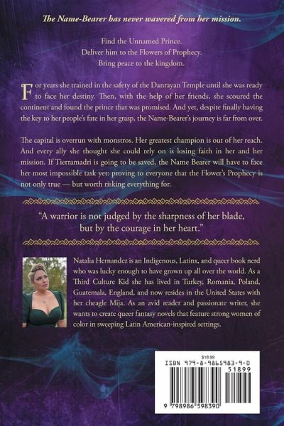 The Name-Bearer has never wavered from her mission. Find the Unnamed Prince. Deliver him to the Flowers of Prophecy. Bring peace to the kingdom. For years she trained in the safety of the Danrayan Temple until she was ready to face her destiny. Then, with the help of her friends, she scoured the continent and found the prince that was promised. And yet, despite finally having the key to her people's fate in her grasp, the Name-Bearer's journey is far from over. The capital is overrun with monstros. Her greatest champion is out of her reach. And every ally she thought she could rely on is losing faith in her and her mission. If Tierramadri is going to be saved, the Name Bearer will have to face her most impossible task yet: proving to everyone that the Flower's Prophecy is not only true - but worth risking everything for.
