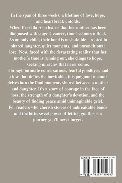 In the span of three weeks, a lifetime of love, hope, and heartbreak unfolds. When Priscilla learns that her mother has been diagnosed with stage 4 cancer, time becomes a thief. As an only child, their bond is unshakable-rooted in shared laughter, quiet moments, and unconditional love. Now, faced with the devastating reality that her mother's time is running out, she clings to hope, seeking miracles that never come. Through intimate conversations, tearful goodbyes, and a love that defies the inevitable, this poignant memoir delves into the final moments shared between a mother and daughter. It's a story of courage in the face of loss, the strength of a daughter's devotion, and the beauty of finding peace amid unimaginable grief. For readers who cherish stories of unbreakable bonds and the bittersweet power of letting go, this is a journey you'll never forget.