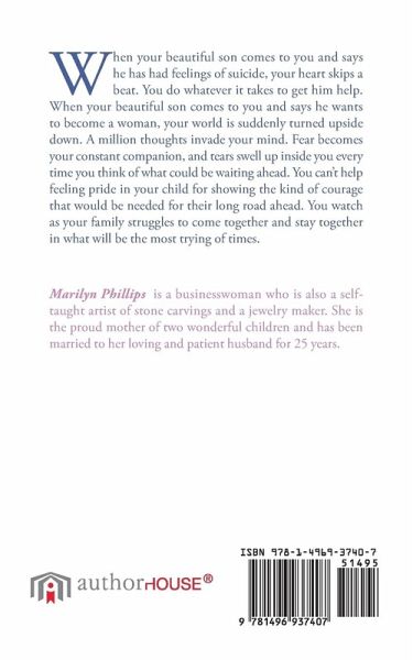When your beautiful son comes to you and says he has had feelings of suicide, your heart skips a beat. You do whatever it takes to get him help. When your beautiful son comes to you and says he wants to become a woman, your world is suddenly turned upside down. A million thoughts invade your mind. Fear becomes your constant companion, and tears swell up inside you every time you think of what could be waiting ahead. You can?t help feeling pride in your child for showing the kind of courage that would be needed for their long road ahead. You watch as your family struggles to come together and stay together in what will be the most trying of times.