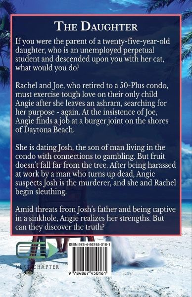 If you were the parent of a twenty-five-year-old daughter, who is an unemployed perpetual student and descended upon you with her cat, what would you do? Rachel and Joe, who retired to a 50-Plus condo, must exercise tough love on their only child Angie after she leaves an ashram, searching for her purpose - again. At the insistence of Joe, Angie finds a job at a burger joint on the shores of Daytona Beach. She is dating Josh, the son of man living in the condo with connections to gambling. But fruit doesn't fall far from the tree. After being harassed at work by a man who turns up dead, Angie suspects Josh is the murderer, and she and Rachel begin sleuthing. Amid threats from Josh's father and being captive in a sinkhole, Angie realizes her strengths. But can they discover the truth?