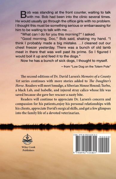 Bob was standing at the front counter, waiting to talk with me. Bob had been into the clinic several times. He would usually go through the office girls with no problem. I thought this must be something serious or embarrassing for him to be waiting to talk with me. ..."What can I do for you this morning?" I asked."Good morning, Doc," Bob said, shaking my hand. "I think I probably made a big mistake. ...I cleaned out our chest freezer yesterday. There was a bunch of old lamb meat in there that was well past its prime. So I figured I would boil it up and feed it to the dogs."Now he has a bunch of sick dogs, I thought to myself. - from "Low Dog on the Totem Pole" - The Daughters Horse_______________The second edition of Dr. David Larsen's Memoirs of a County Vet series continues with more stories added to The Daughter's Horse. Readers will meet Smudge, a Siberian Mouse Hound; Turbo, a black Lab, and Isabelle, and injured stray calico whose life was saved because she gave her rescuer a nasty bite. Readers will continue to appreciate Dr. Larsen's concern and compassion for his patients, enjoy his personal relationships with his clients, appreciate David's surgical skills, and get a few glimpses into the family life of a devoted veterinarian.