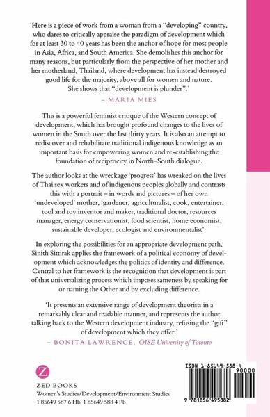 This is a powerful feminist critique of the 'Western' concept of development. It is also an attempt to rediscover and rehabilitate traditional indigenous knowledge as an important basis for empowering women and re-establishing the foundation of reciprocity in North-South dialogue. The author looks at the wreckage "progress" has wreaked on the lives of Thai sex workers and of indigenous peoples globally and contrasts this with a portrait - in words and pictures - of her own "undeveloped" mother, 'gardener, agriculturalist, cook, entertainer, tool and toy inventor and maker, traditional doctor, resources manager, energy conservationist, food scientist, home economist, sustainable developer, ecologist and environmentalist'. In exploring the possibilities for an appropriate development path, Sinith Sittirak applies the framework of a political economy of development which acknowledges the politics of identity and difference. Central to her framework is the recognition that 'development' is part of that universalizing process which imposes sameness by speaking for or naming the 'Other' and by excluding difference.