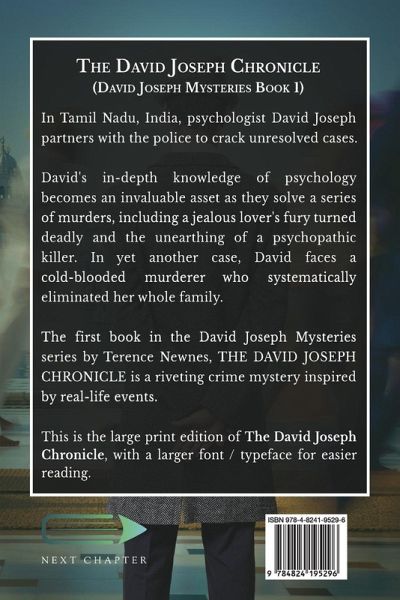 In Tamil Nadu, India, psychologist David Joseph partners with the police to crack unresolved cases. David's in-depth knowledge of psychology becomes an invaluable asset as they solve a series of murders, including a jealous lover's fury turned deadly and the unearthing of a psychopathic killer. In yet another case, David faces a cold-blooded murderer who systematically eliminated her whole family. The first book in the David Joseph Mysteries series by Terence Newnes, THE DAVID JOSEPH CHRONICLE is a riveting crime mystery inspired by real-life events. This is the large print edition of The David Joseph Chronicle, with a larger font / typeface for easier reading.