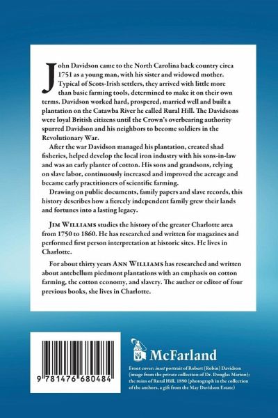 John Davidson came to the North Carolina back country circa 1751 as a young man, with his sister and widowed mother. Typical of Scots-Irish settlers, they arrived with little more than basic farming tools, determined to make it on their own terms. Davidson worked hard, prospered, married well and built a plantation on the Catawba River he called Rural Hill. The Davidson's were loyal British citizens who paid their taxes and participated in colonial government. When the Crown's overbearing authority interfered, independence became paramount and Davidson and his neighbors became soldiers in the Revolutionary War. After the war Davidson managed his plantation, created shad fisheries, helped develop the local iron industry with his sons-in-law and was an early planter of cotton. His sons and grandsons, along with their slave families, continuously increased and improved the acreage and became early practitioners of scientific farming. Drawing on public documents, family papers and slave records, this history describes how a fiercely independent family grew their lands and fortunes into a lasting legacy.