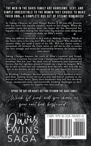 The men in the Davis family are handsome, sexy, and simply irresistible to the women they choose to make their own. In Taking Chances, Abby is a divorcée who discovers true physical satisfaction for the first time. But just when she thinks she's found her happily-ever-after, a big surprise shakes up her world. Abby is in a difficult position in Making Choices. She must choose between the Davis twin brothers. Will her decision ruin her relationship with one of the brothers, or cause the twins' sibling rivalry to spiral out of control? In Faking Changes, Abby's best friend, Courtney, finds love with one of the Davis twins. But her dark past threatens to ruin everything. The next generation of Davis brothers face their own share of twists and turns as they search for love and happiness in Breaking Challenges. Spend the day (or night) with the Davis family and find your next book boyfriend. This sizzling 4-book set is sure to leave you breathless. This spicy contemporary romance 4-book set is filled to the brim with family drama and steamy romance. Grab it now!