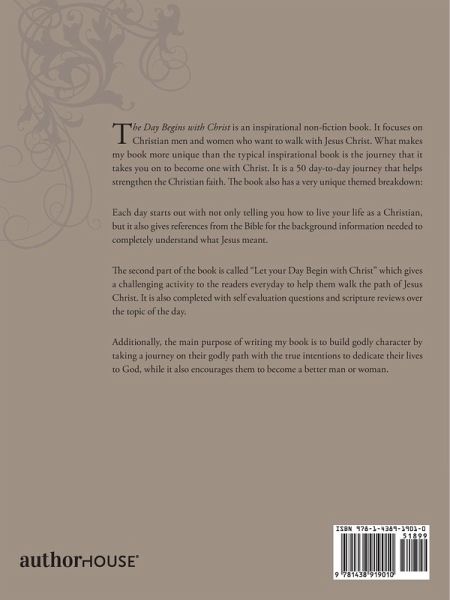 Day Begins with Christ, is an inspirational non-fiction book. It focuses on Christian men and women who want to walk a better path with Jesus Christ. What makes my book more unique than the typical inspirational book is the journey that it takes you on to become one with Christ. It is a 50 day to day journey that helps strengthen the Christian faith. This book builds each person's character, journey on their godly path to walk with God, and encourages one to see what they can work on to make a better man or woman. It is personal, challenging, and understanding the Christian walk on a daily…mehr