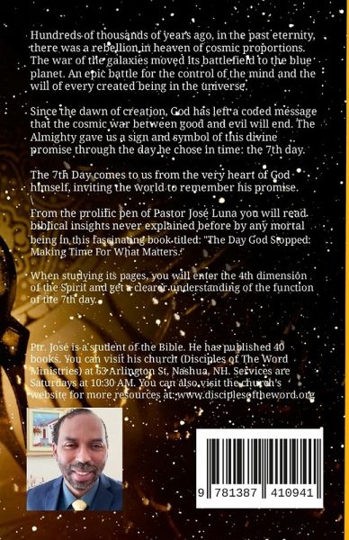 Hundreds of thousands of years ago, in the past eternity, there was a rebellion in heaven of cosmic proportions. The war of the galaxies moved its battlefield to the blue planet. An epic battle for the control of the minds and the will of every created being in the universe. Since the dawn of creation, God has left us a coded message that the cosmic war between good and evil will end. The Almighty God gave us the sign and symbol of this divine promise through the day He chose in time: the 7th day. Such a day comes to us from the very heart of God Himself, inviting the world to remember His promise. From the prolific pen of José Luna, you will read biblical explanations about the 7th Day that you have never heard before in this fascinating book titled: "The Day God Stopped: Making Time For What Matters." As you read this book, you will enter the 4th dimension of the Spirit, and you will get a clearer understanding of the function of the 7th day.
